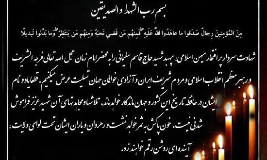 تسلیت شهادت سردار حاج قاسم سلیمانی admin 2020/01/05 اخبار, اخبار شهرداری, فرهنگ و هنر, گالری تصاویر 954 بازدید روابط عمومی شهرداری و شورای اسلامی شهر وایقان 2020-01-05 admin